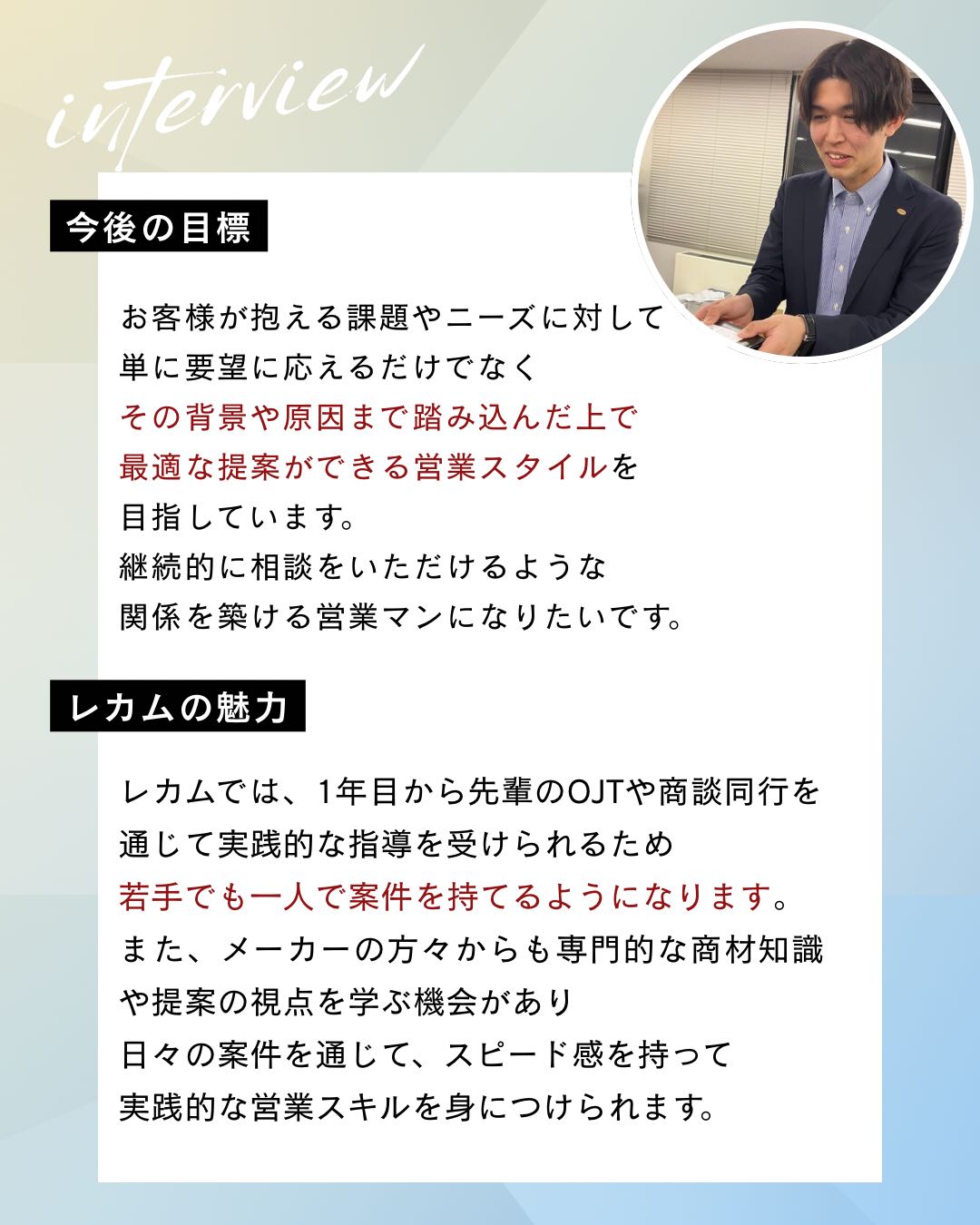 1年を通じて、実際に働く中で感じた成長やレカムの魅力について聞いてみました。